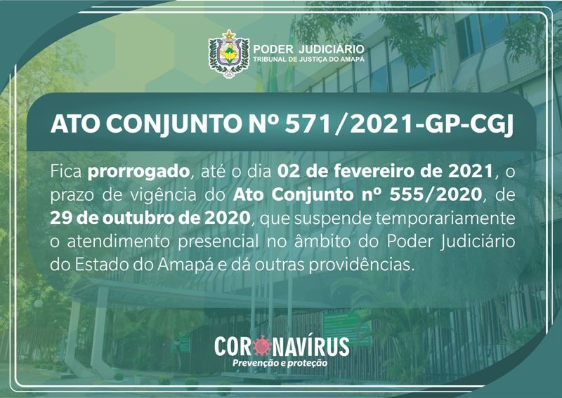 A Presidência e a Corregedoria-Geral do Tribunal de Justiça do Amapá (TJAP) editaram, nesta terça-feira (26 de janeiro), o Ato Conjunto nº 571/2021-GP-CGJ, que prorroga até 02 de Fevereiro de 2021 a suspensão do atendimento presencial de partes, advogados e interessados em todas as unidades judiciais e administrativas do do Judiciário amapaense. A normativa também mantém, preferencialmente, o regime de trabalho remoto, em virtude da necessidade de continuidade na adoção de medidas restritivas e de prevenção para evitar a proliferação do contágio do novo coronavírus. A Normativa prorroga os efeitos do Ato Conjunto nº 555/2020 e segue em consonância com as determinações do Poder Executivo Estadual, no Decreto 0217/2021.