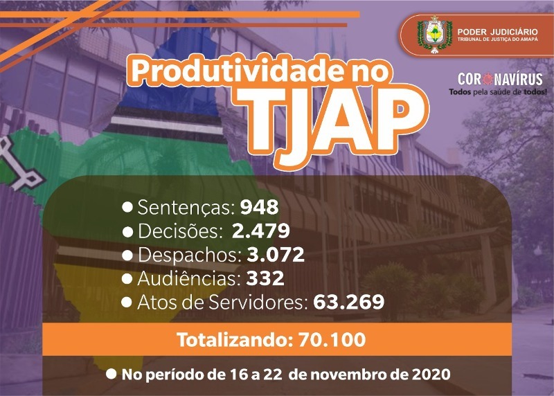 Semanalmente a Secretaria de Gestão Processual e Eletrônica do Tribunal de Justiça do Amapá (SGPE-TJAP) divulga, por meio de relatório, a produtividade da Justiça do Amapá, em atendimento à normativa do Conselho Nacional de Justiça (CNJ). No período de 16 a 22 de novembro, enfrentando racionamento de energia e distanciamento social em face da pandemia de Covid-19, as unidades judiciárias e o TJAP realizaram 70.100 atos processuais.
