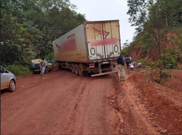 Na tarde deste sábado (30), uma carreta deslizou na pista e bloqueou por mais de 12 horas o tráfego de veículos no quilômetro 764 da BR-156, entre as cidades de Calçoene e Oiapoque.