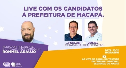 A live será mediada pelo Presidente do TRE/AP, Desembargador Rommel Araújo, e contará com a participação dos candidatos à Prefeitura de Macapá, Dr. Furlan (Cidadania) e Josiel (Democratas). A ideia é sortear temas como saúde, educação, assistência, lazer, entre outros, para que os candidatos apresentem suas propostas.