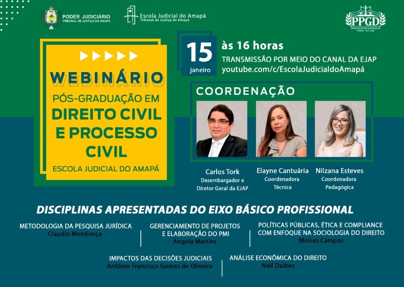 A Escola Judicial do Amapá (EJAP) realizará, nesta sexta-feira (15), a partir das 16 horas, o primeiro Webinário do Curso de Pós-Graduação lato sensu em Direito Civil e Processo Civil: Eixo de Formação Básico ofertada para servidores do Poder Judiciário Amapaense e também para a comunidade. Com transmissão por meio do canal da EJAP no YouTube (ACESSE AQUI), serão abordados assuntos pertinentes à construção do curso diante das necessidades do Poder Judiciário, apresentando seu corpo técnico, docentes e debatendo seus componentes curriculares com a comunidade.